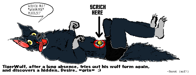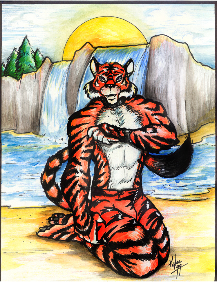 A refugee from a destroyed world, Tigerwolf is a friendly, but shy, bengal tiger / black wolf morph standing just over 6 feet tall on plantigrade feet. In his current tiger form, his fur is typical tawny-orange and white tiger colors with black stripes. The stripe pattern on his face gives the appearance of a very slight, permanent smile. His eyes are an irridescent green-gold, sparkling, but somewhat introspective. His long, striped tail has an amusing tendency to frizz when he is startled. He is powerfully built, solid, but not excessively muscular. He is wearing only tiger-striped shorts which closely match his body colors. From a distance, it is difficult to tell if he is clothed or not. A small, black, multi-function communicator-watch is strapped on his left wrist. Being cautious and quite shy, he is not particularly easy to get to know well; but to those who are close to him, he is a fiercely loyal and loving friend. He has a soft smile, and a gentle manner.